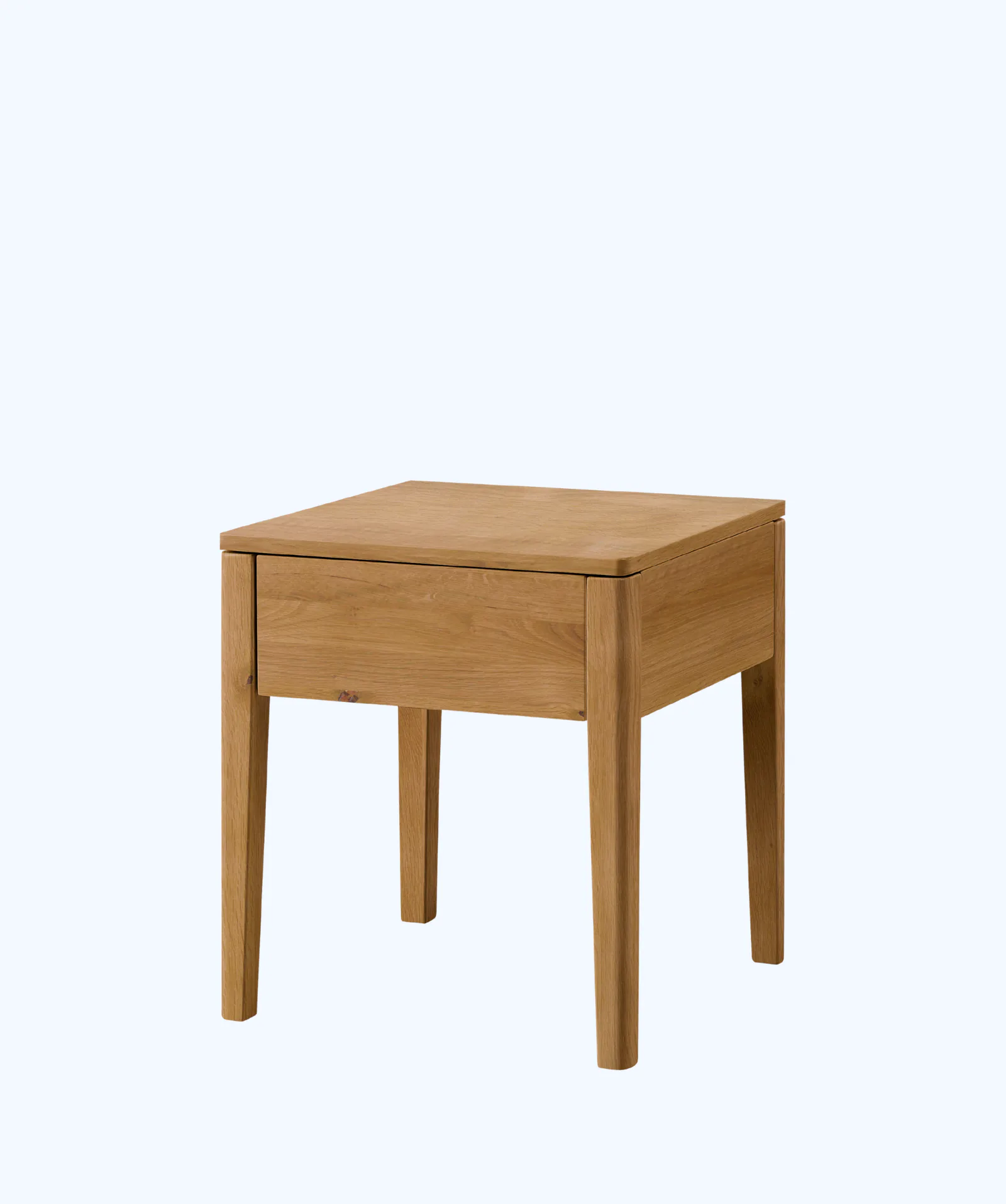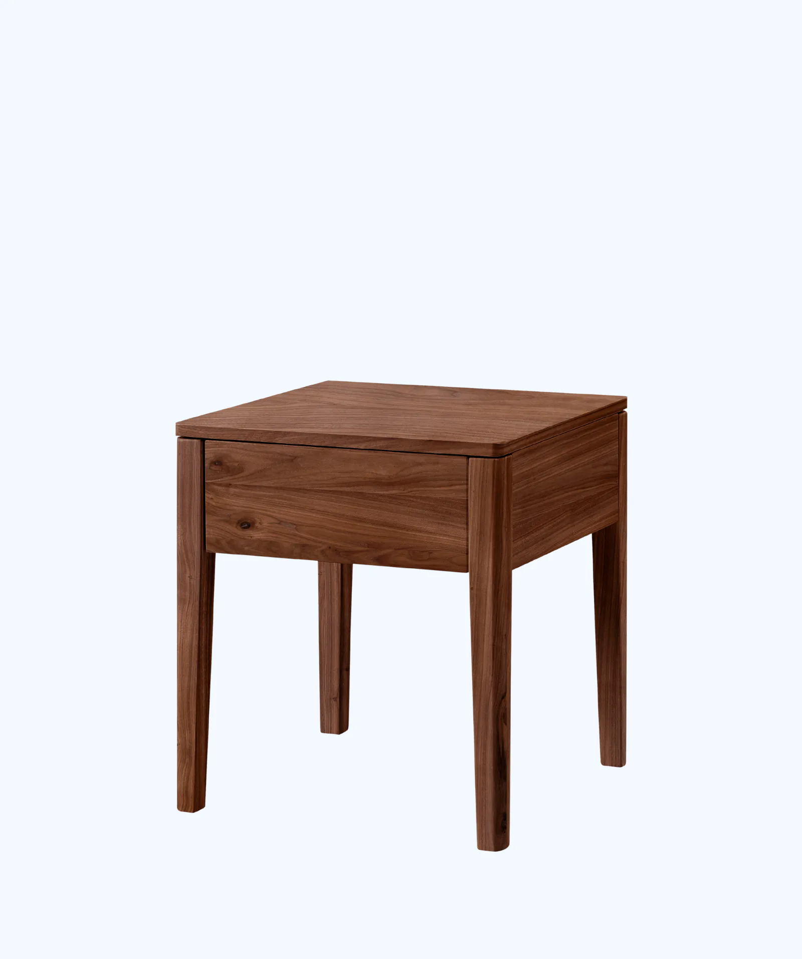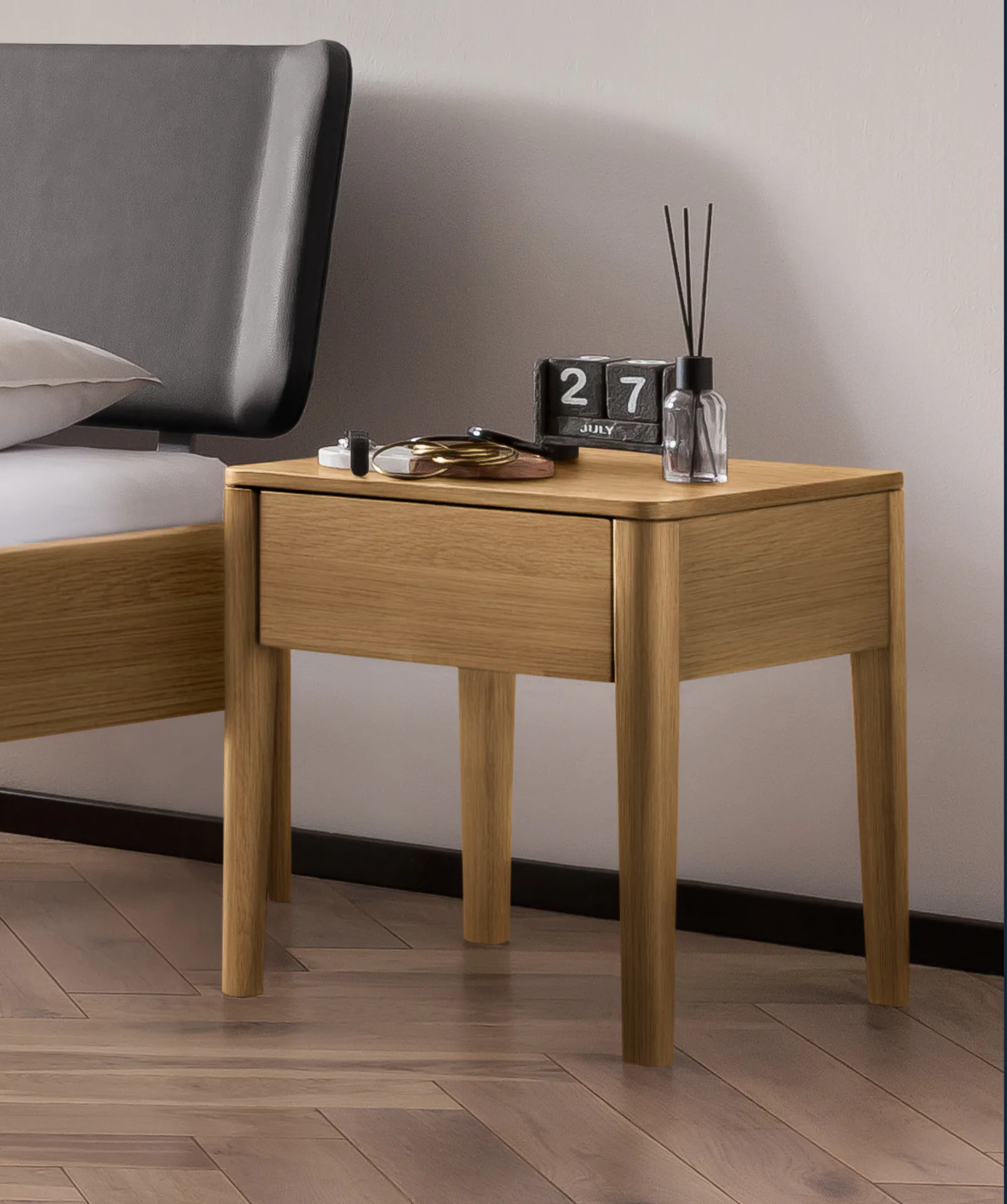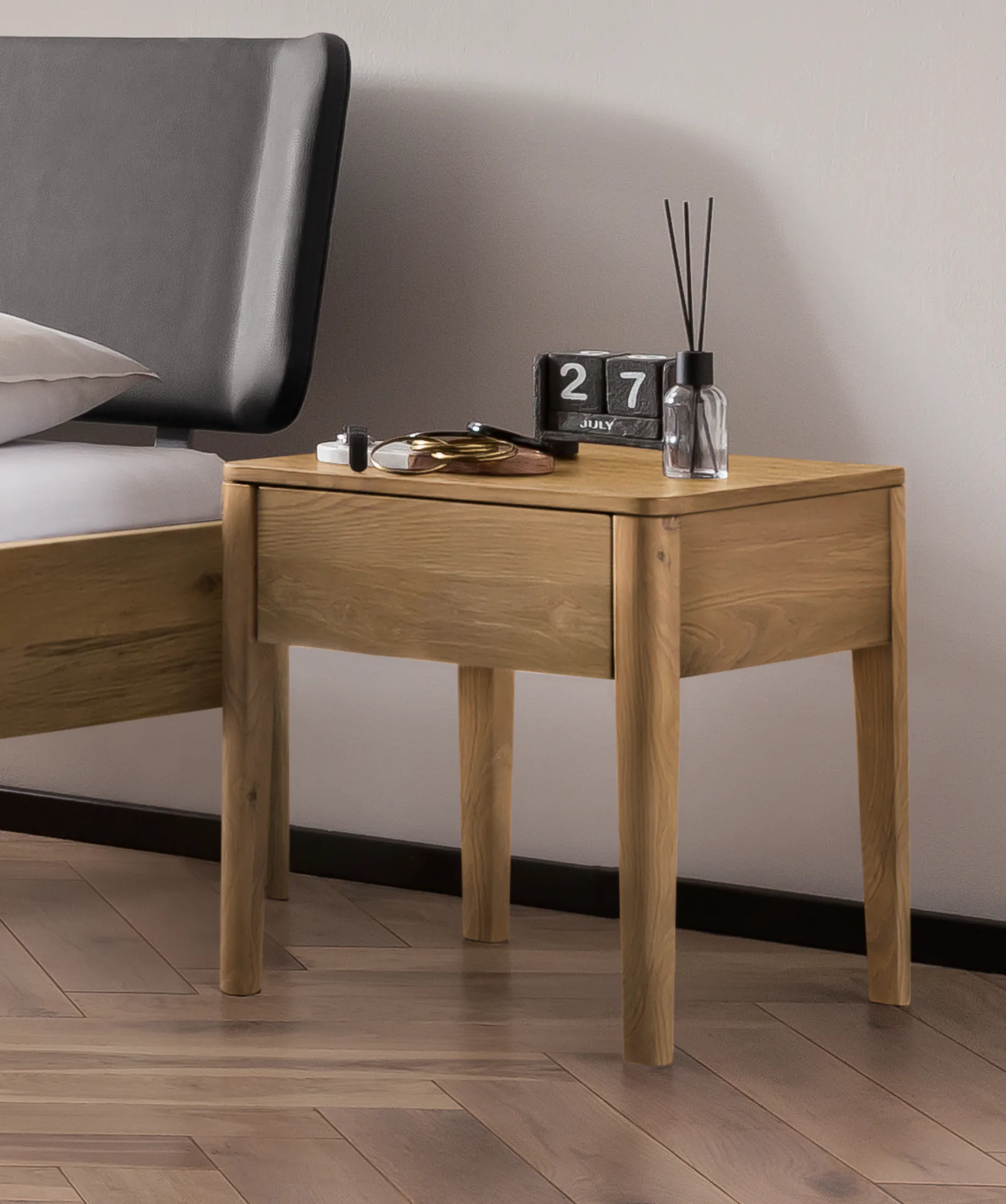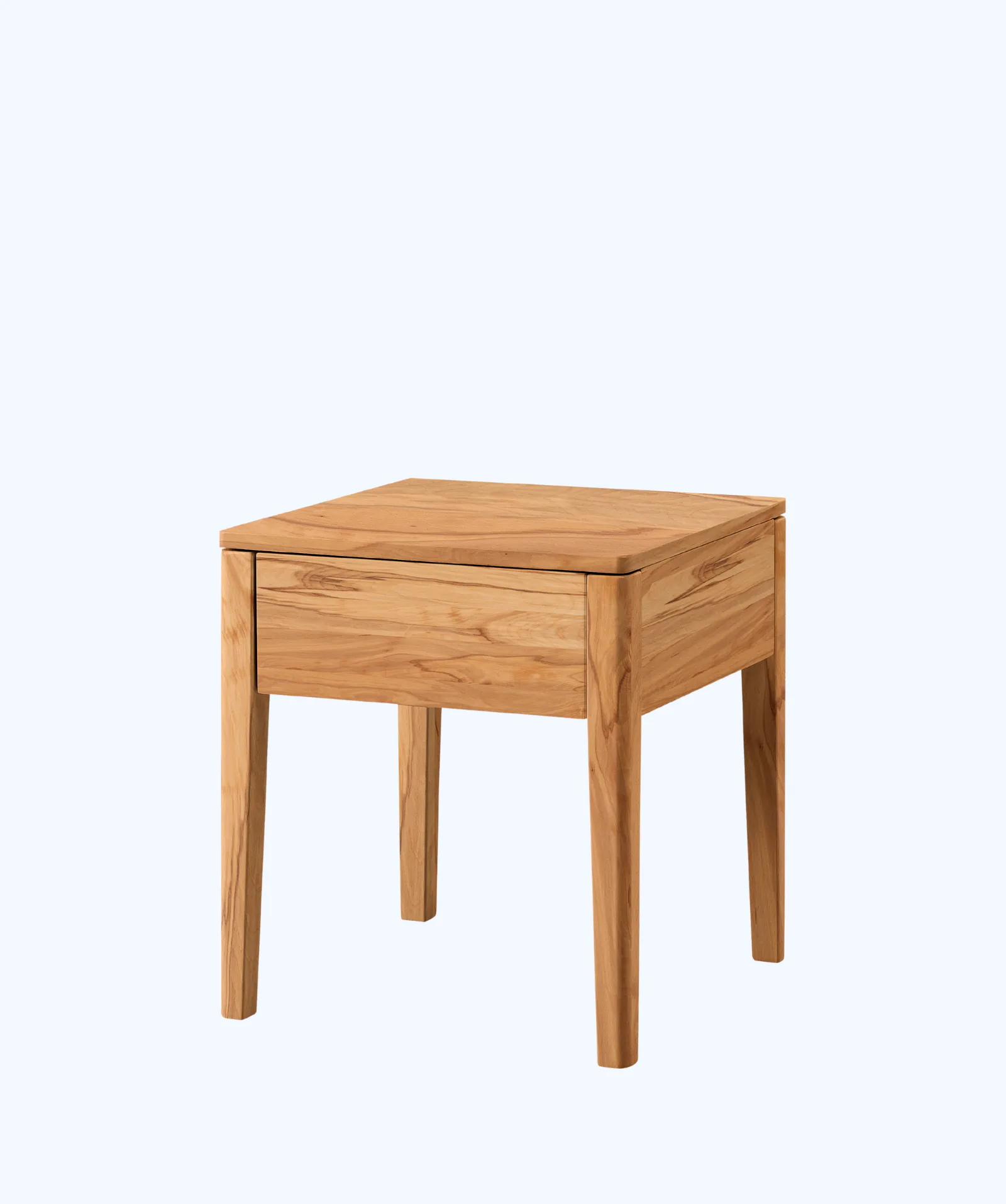 Der Nachttisch begleitet Holz- und Polsterbetten gleichermaßen stimmig. Seine kompakte Silhouette wirkt nicht wuchtig, bietet dennoch praktische Ablage und fügt sich elegant in moderne wie zeitlos natürliche Einrichtungen – ideal, wenn Sie Klarheit und Wärme schätzen.