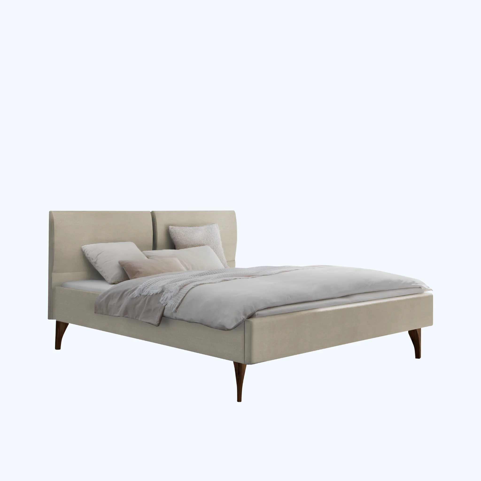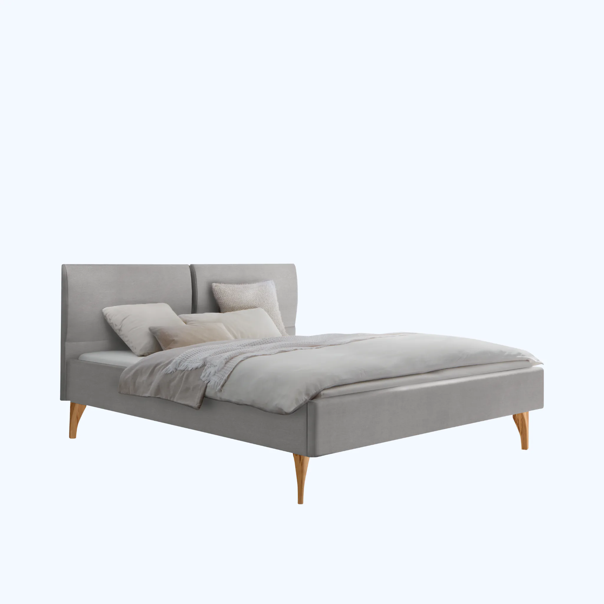 Polsterbett mit gepolstertem Kopfteil und pflegeleichtem Polyesterbezug. Massivholzfüße in zwei Höhen, Farben auswählbar. Erhältlich in 3 Größen und 2 Farben.