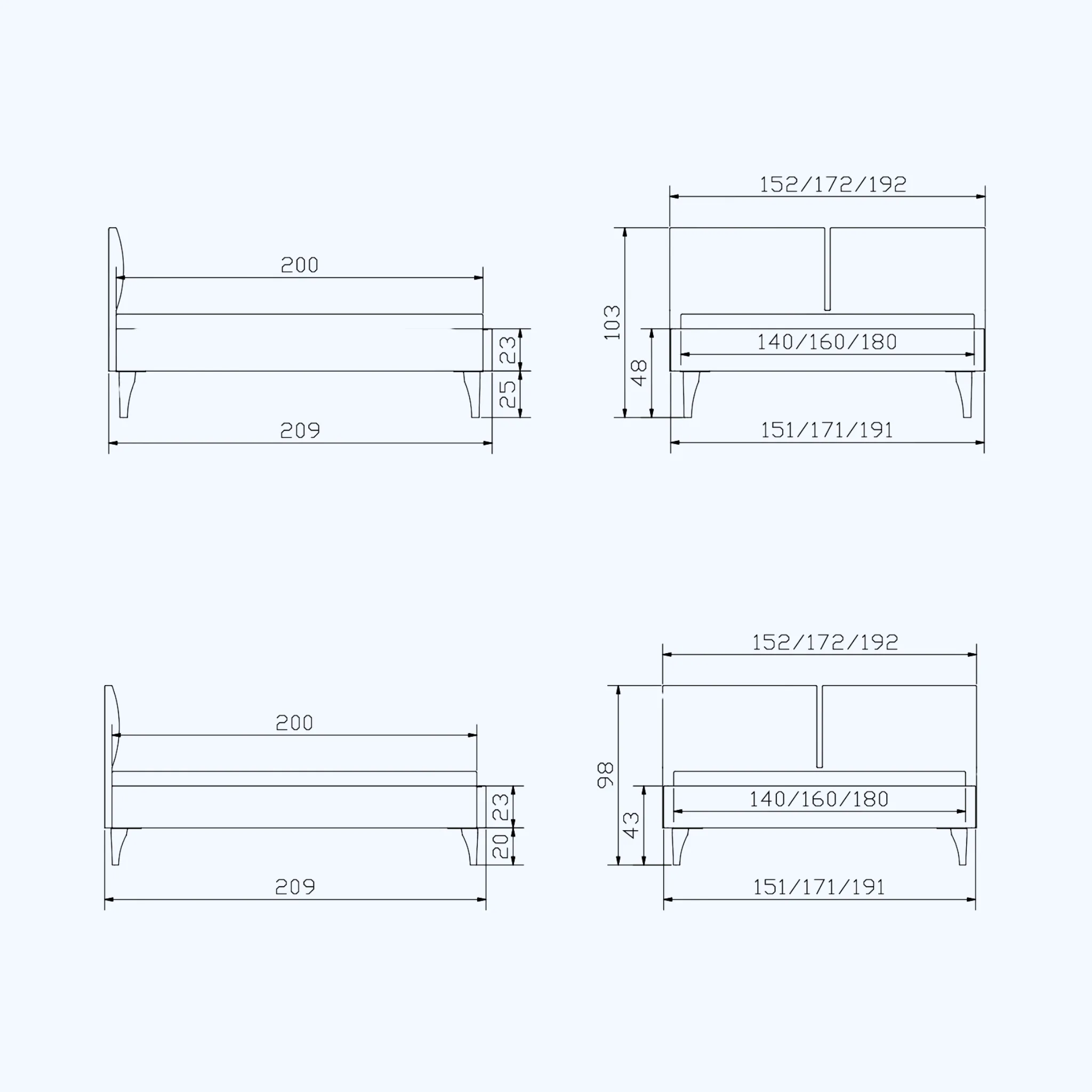 | Maße (Breite x Länge x Höhe) | 152x209x103 cm, 152x209x98 cm, 172x209x103 cm, 172x209x98 cm, 192x209x103 cm, 192x209x98 cm |