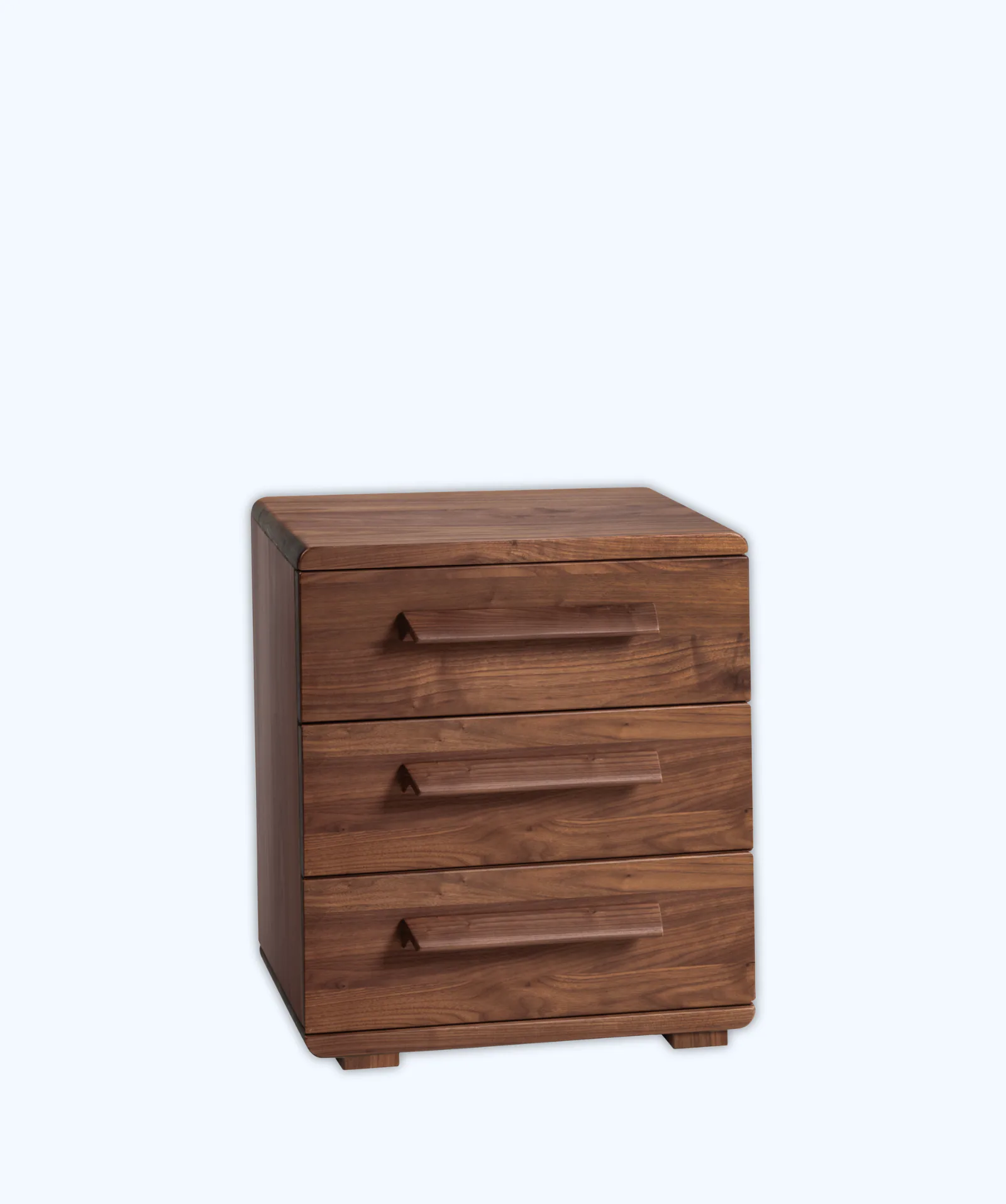 Mit kompakten Maßen von 48×43×55 cm findet Trigo auch neben kleineren Betten Platz. Innen bieten die Schubladen strukturierte Fläche, sodass Brille, Lektüre und Pflegeprodukte ordentlich verstaut sind. Oberflächen zur Wahl: Buche weiß lackiert, Kernbuche natur geölt oder Nussbaum geölt – leicht zu Boden, Bett und Textilien abstimmbar.